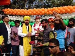 भीलवाड़ा ( बलराम वैष्णव ):- क्षेत्र के अगरपुरा गांव में स्वतंत्रता सेनानी एवं क्रांतिकारी शहीदे आजम भगत सिंह जी का मंदिर में मूर्ति का अनावरण आज रविवार को शहीदे आजम के पौत्र यादविन्दर सिंह के द्वारा किया गया, इस दौरान भारत माता, वंदे मातरम, इंकलाब जिंदाबाद, शहीद भगत सिंह अमर रहे के नारों का जयघोष किया गया । नशा मुक्त युवा भारत आंदोलन के सूत्रधार नारायण भदाला ने बताया कि अगरपुरा गांव रोड़ वाले बालाजी मंदिर पर आजादी की क्रांति के जननायक रहे स्वतंत्रता सेनानी एवं क्रांतिकारी शहीदे आजम भगत सिंह जी की मंदिर में मूर्ति का अनावरण किया गया । अगरपुरा गांव रोड़ के बालाजी मंदिर के पास में शहीदे आजम भगत सिंह जी के मंदिर में अनके पौत्र यादविन्दर सिंह संधू के द्वारा दोपहर को मंदिर में मूर्ति का अनावरण किया गया । मंदिर में देशभक्तों के चित्र बनाए गए । शहीद भगत सिंह की मूर्ति ग्रेनाइट के पत्थर से 32 इंच की बनाई गई, ग्रामीणों द्वारा यादविन्दर सिंह का माला पहनाकर स्वागत किया गया, 8 ढोलो के साथ पुष्प वर्षा कर स्वागत किया, यादविन्दर सिंह के साथ ही उनके साथ पहुंची टीम का भी माला पहनाकर स्वागत किया । मंच का संचालन सूरज पारीक द्वारा किया गया । इस दौरान कुमार राकेश, अजय गोड़, नैना जाट, खुशी जाट, प्रेम शंकर, मोहम्मद शाहिद ने देशभक्ति भजनों व गीतों की प्रस्तुतियां दी । इस दौरान यादविन्दर सिंह सभा को संबोधित करते हुए कहा कि भगत सिंह हमारे दिलों में जिंदा है, 23 मार्च 1931 को अंग्रेजों ने उनको फांसी दी, मृत्यु के साथ उनका संघर्ष हुआ और मृत्यु उनसे हार गई की, कि जब मृत्यु उनके गले में फांसी का फंदा बनाकर पहुंची, तब तक वह हिंदुस्तानियों के दिलों में बस चुके थे और हमारे दिलों में आ गए और अजर अमर हो गए, साथ ही कहा कि युवाओं को शहीद भगत सिंह जी के आदर्शो को अपने जीवन में उतरने को कहा । कार्यक्रम के दौरान कार्यक्रम को सफल बनाने वाले भामाशाहों को सम्मानित किया गया । इस दौरान बड़ी संख्या महिला पुरुष व युवक युवतियां मौजूद रही । आर्टिस्ट के जी कदम द्वारा 5 मिनिट में रक्त से लाइव फ़ोटो बनाया गया । जिसमें रक्त नारायण भदाला का लिया गया । 18 गावों में गो उपचार केंद्र व गोशाला अपने स्तर पर चलाने वाले गो भक्तों को सम्मानित किया गया । इस दौरान हंसराज चौधरी, ओम प्रकाश जाट , हंसराज अटारिया, नारायण जाट, सुरेश धाकड़ , रवींद्र जुनेजा सहित गाँव के युवा कार्यकर्ता उपस्थित रहे ।