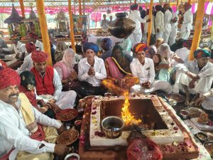 भीलवाड़ा ( बलराम वैष्णव ):- सवाईपुर कस्बे के निकटवर्ती लखमणियास गांव में तेजाजी महाराज मंदिर शिखर कलश की स्थापना को लेकर आयोजित पांच दिवसीय नव कुंडात्मक महारूद्र यज्ञ के चौथे दिन कलश का सहस्त्र धारा अभिषेक किया तथा हवन कुंड में आहुतियां लगाई, वही नव कुंडात्मक महारुद्र यज्ञ की पूर्णाहुति कल होगी । ग्रामीणों ने बताया कि तेजाजी महाराज के मंदिर पर कलश व मंदिर प्रांगण में तेजाजी महाराज की घोड़ी की स्थापना को लेकर नीलकंठ महादेव मांडल व सरेड़ी के महंत दीपक पुरी जी महाराज के सानिध्य में पांच दिवसीय महारुद्र यज्ञ की शुरुआत सोमवार को कलश यात्रा के साथ हुआ । जिसमे कल दोपहर कलश स्थापना के साथ पूर्णाहुति होगी, बड़ी संख्या में आसपास के गांवों से ग्रामीण पहुंच रहे हैं, जो तेजाजी महाराज के आशीर्वाद लेने के साथ ही मेला चौक में लगे डोलर चकरी व झूले का आनंद ले रहे हैं । यज्ञाचार्य चांदमल उपाध्याय सवाईपुर ने बताया कि प्रातः 9:15 बजे स्थापित देवी-देवताओं का हवन पूजन कर आह्वान किया, शिखर कलश का सहस्त्रधारा अभिषेक किया, वही कलश का शकराधिवास, फलाधिवास व पुष्पाधिवास किया गया, वैदिक मंत्रोच्चार के साथ 85 जोड़ों ने 9 हवन कुंडों में रुद्र सुक्त की 51 हजार आहुतियां लगाई । रतन दास सारण व सत्तू कीर कोदूकोटा एंड पार्टी ने तीसरे दिन बुधवार रात्रि को तेजाजी महाराज हीरा गुजरी की कोठी में रुकने, मीणा द्वारा हीरा गुजरी के गायों को चुराने व तेजाजी महाराज द्वारा गायों को लेने जाने आदि कई पात्रों का मंचन किया गया ।