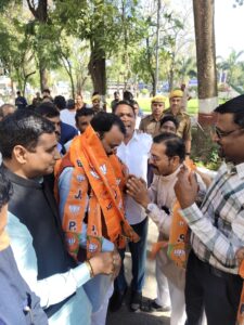 भीलवाड़ा ( बलराम वैष्णव ):- राजस्थान के उपमुख्यमंत्री एवं जिला प्रभारी मंत्री प्रेमचंद बेरवा का आज रविवार को एक दिवसीय दौरे पर भीलवाड़ा आगमन पर भाजपा जिला अध्यक्ष प्रशांत मेवाड़ा के नेतृत्व में भाजपा जिला संगठन के तत्वावधान में सर्किट हाउस में स्वागत अभिनंदन किया गया । इस अवसर पर भीलवाड़ा सांसद दामोदर अग्रवाल, विधायक अशोक कोठारी, महापौर राकेश पाठक मौजूद थे । भाजपा जिला मीडिया प्रभारी महावीर समदानी में बताया कि उप मुख्यमंत्री के सर्किट हाउस आने पर ढोल नगाड़ों बजा कर जोरदार स्वागत अभिनंदन कर उन्हे गार्ड ऑफ ऑनर दिया गया । भाजपाईयों ने मेवाड़ी पगड़ी पहनाकर पदाधिकारियो ने अपना परिचय देकर भाजपा का दुपट्टा पहनाकर उनका स्वागत सत्कार किया । स्वागत करने वाले में राजकुमार आचलिया, अविनाश जीनगर, छैल बिहारी जोशी, बाबूलाल आचार्य, भगवती जोशी, सुरेंद्र सिंह मोटरास, गोपाल तेली, राधेश्याम कुमावत, नंदलाल गुर्जर, कुलदीप शर्मा, पूरन डीडवाना, मनीष पालीवाल, शिव चनाल, गौतम शर्मा, बजरंग सिंह राणावत, नागेंद्र राव ,ऋतु शेखर शर्मा, प्रेम स्वरूप गर्ग, अनमोल पराशर, लादू लाल तेली, बाबूलाल टाक, राजेश सेन, अजय नौलखा,आकाश मालावत, सौरव काबरा, दीपक पाराशर, संदीप पायक, आरती कोगटा, शोभीका जागेटीया, मधु शर्मा, अनमोल पाराशर, संदीप पायक आदि पदाधिकारी एवं कार्यकर्ता शामिल थे ।।